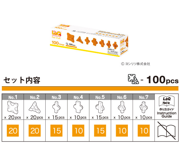 お手持ちのセットへの色の追加、補充に使えるLaQ フリースタイル 100。このパッケージにはオレンジ色のLaQブロック全種100個がバランスよく入っています。