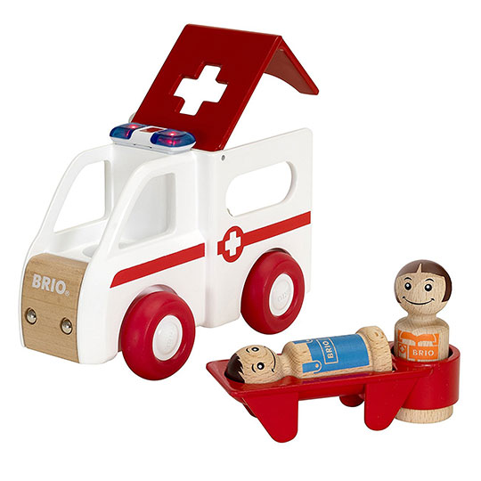 患者をストレッチャーに乗せ、救急車に運び入れましょう。担架はきっちり収納できます。救急車のドアを閉めて、ライトとサイレンを鳴らしながら、病院に急行しよう。ピーポー、ピーポー!患者を担架にのせて救急車に運び入れ、病院へ急行だ!!ライトとサイレンを鳴らしましょう。※LR44電池×2個使用(付属)