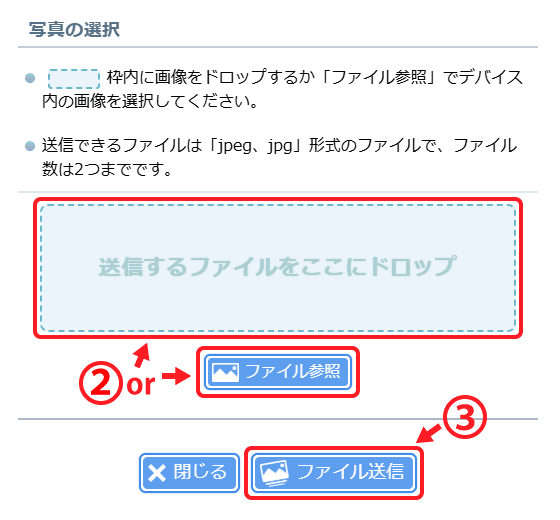 (2) ドロップエリアに写真をドロップいただくか。「ファイル参照」ボタンよりデバイス内の画像を選択いただけます。